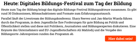 Heute ist Tag der Bildung, eine Initiative vom Stifterverband für die Deutsche Wissenschaft. Viele kleine und großen Angebote finden digital und vor Ort statt. Dazu gibt es die zentrale Bildungskonferenz. Das Bildung.Table-Team hat aus der großen Auswahl ein paar spannende Termine für sie zusammengestellt. Alle Events finden heute über den Tag verteilt statt. Infos & Registrierung