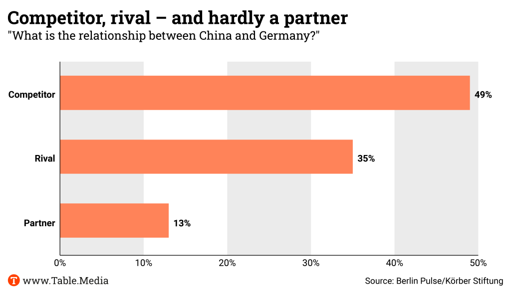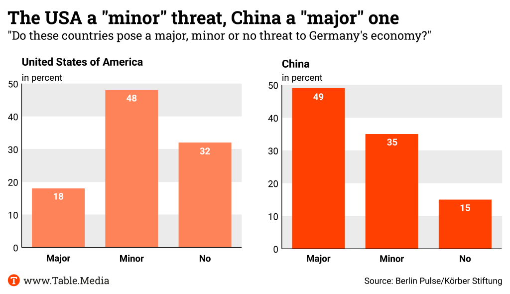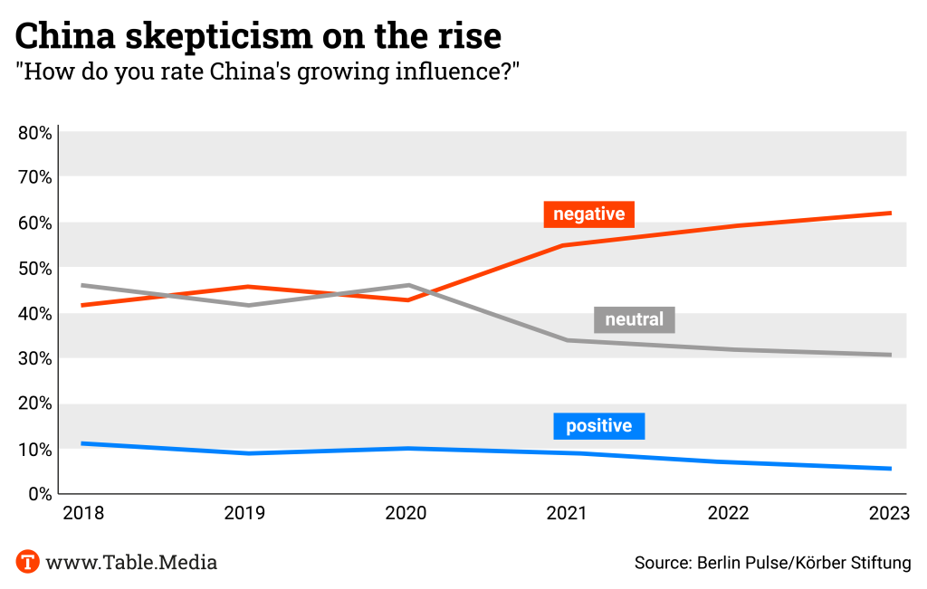 However, this perception is becoming less and less mutual. A growing number of Germans look at China with concern. Around 62 percent of Germans have a negative view of the People’s Republic’s growing influence. Only six percent still consider it positive. This is the result of the representative survey “The Berlin Pulse” conducted by the Koerber Foundation.