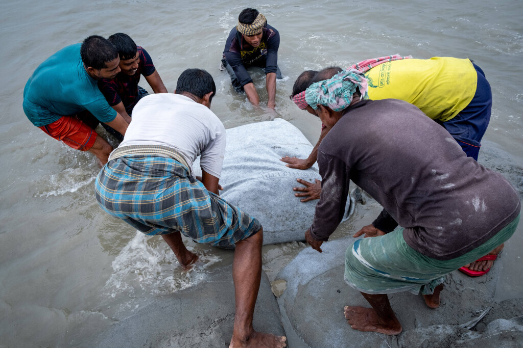 In Pratapnagar (Bangladesh), men are building a dam made of sandbags to protect their village from rising water levels, erosion and salinization of the soil. (Imago/Martin Bertrand)