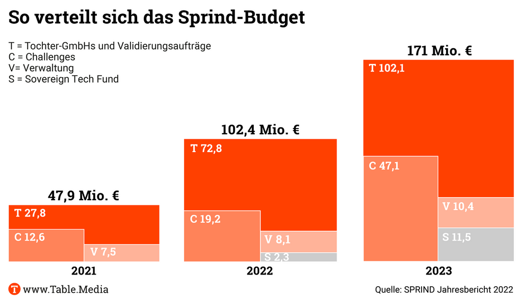 Das BMBF hebt die bisherige Aufstockung des Budgets hervor: Seit Gründung habe sich die Sprind erfolgreich entwickelt, sagt eine Ministeriumssprecherin. “Um dem Bedarf der Sprind gerecht zu werden, wurde ihr Budget von rund 50 Millionen Euro in 2021 auf rund 150 Millionen Euro in 2023 erhöht.”